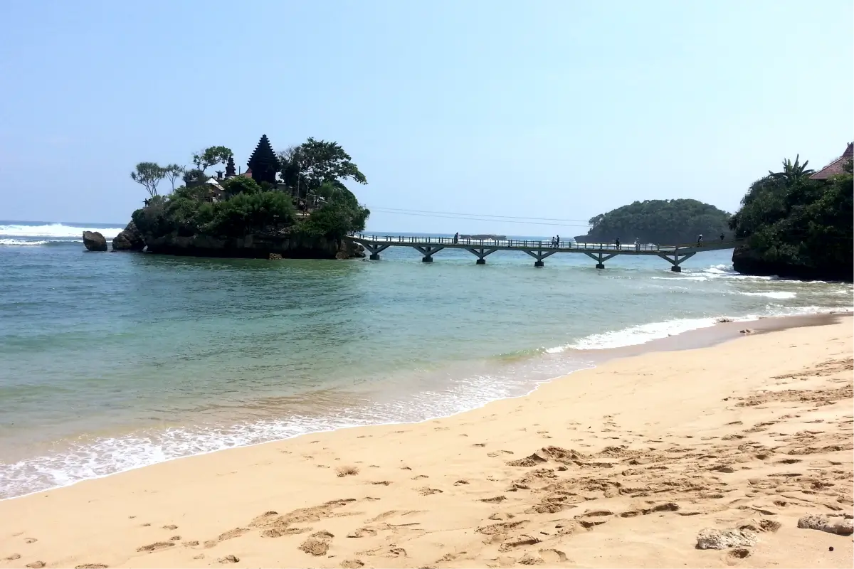 Pantai paling populer di Malang Selatan dengan ikon pura di atas batu karang yang megah. Hamparan pasir luas dan akses yang cukup nyaman membuatnya cocok untuk liburan keluarga maupun rombongan besar.